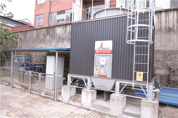 采用闭式喷淋冷却塔作为降温设备,冷却用水在盘管内密闭循环,喷淋水借风机之力与密闭的盘管进行热交换,可以将高55℃的热水冷却至32℃,将冷却后的水温降至湿球温度正负4℃左右;